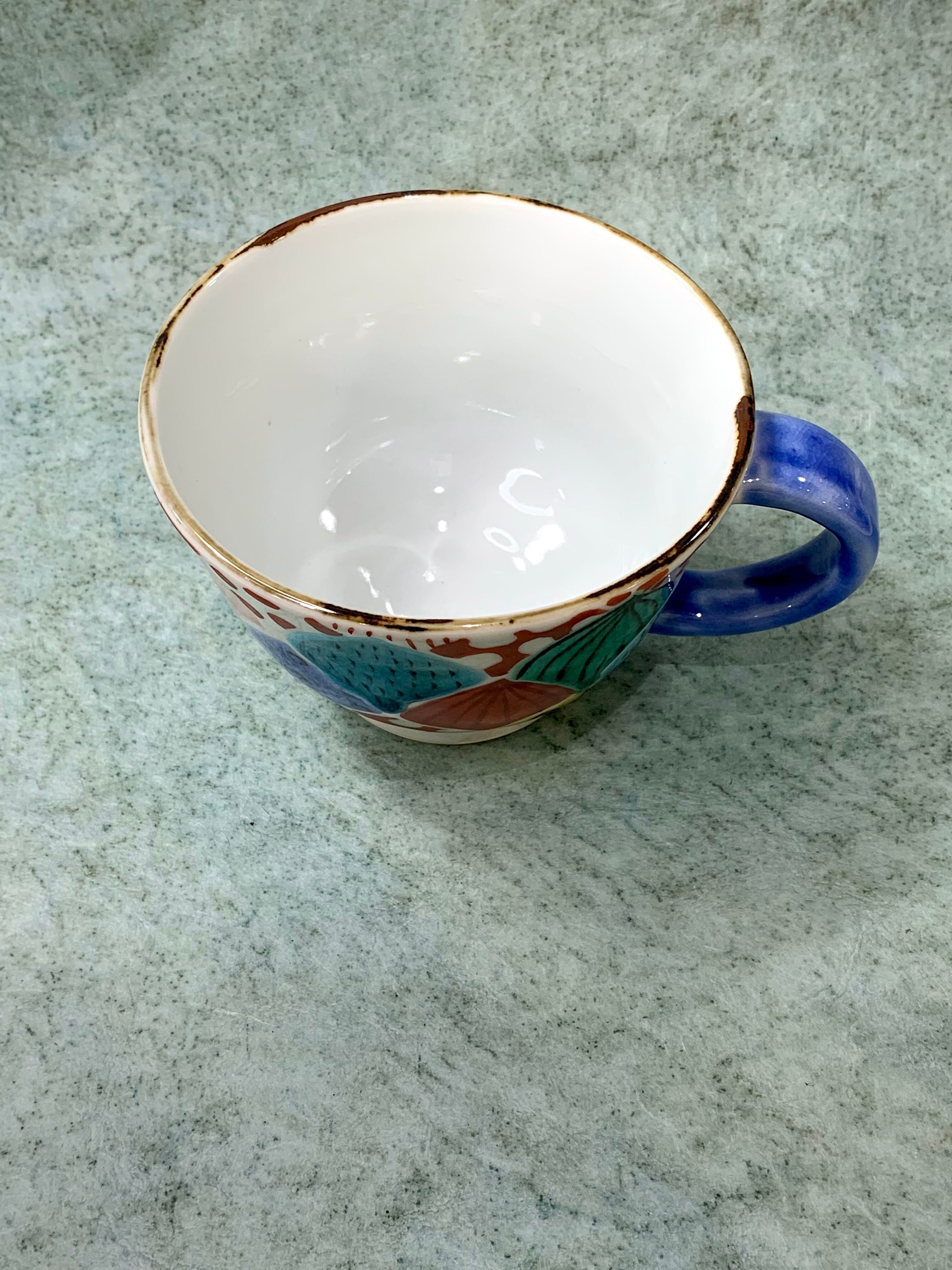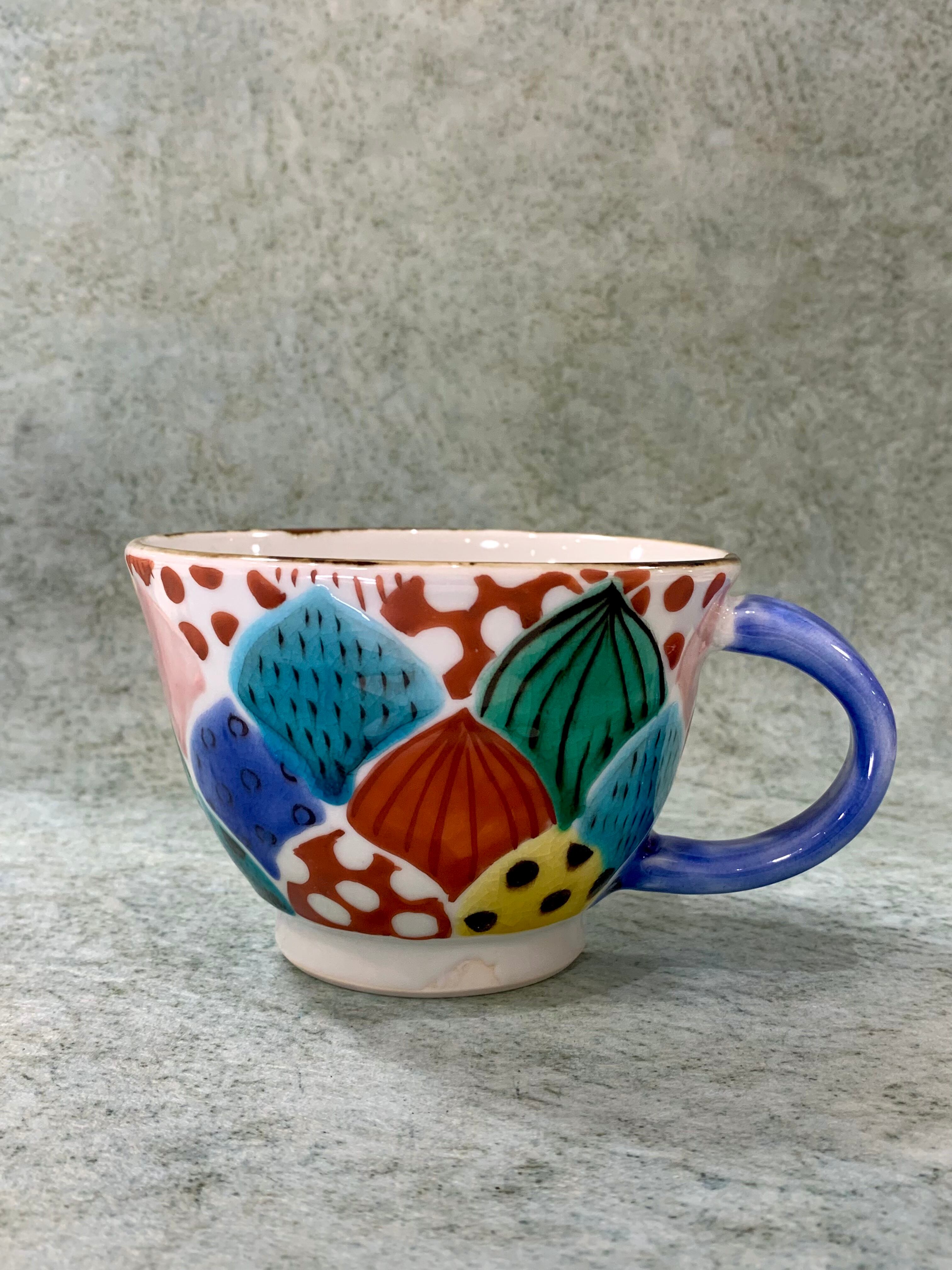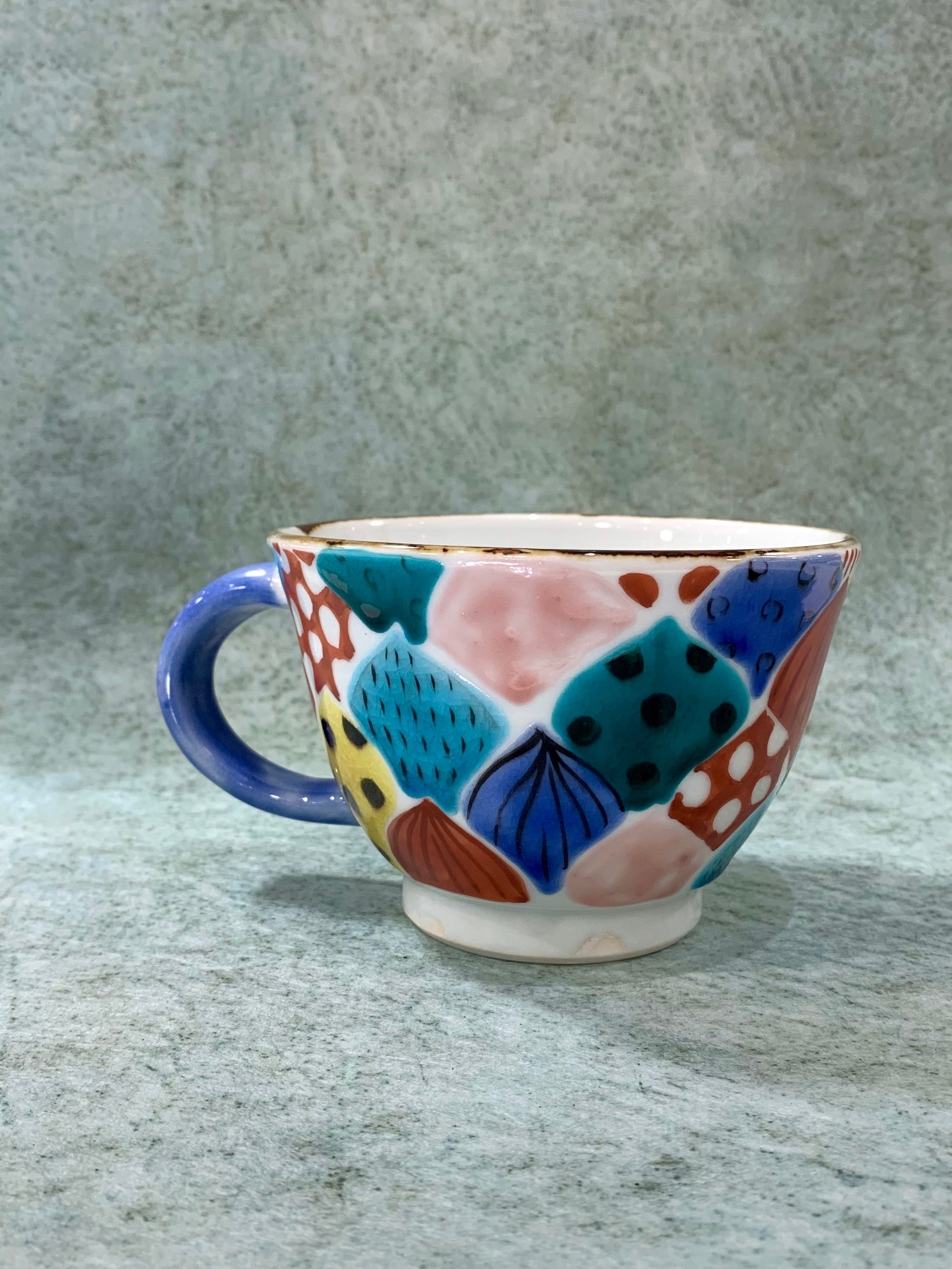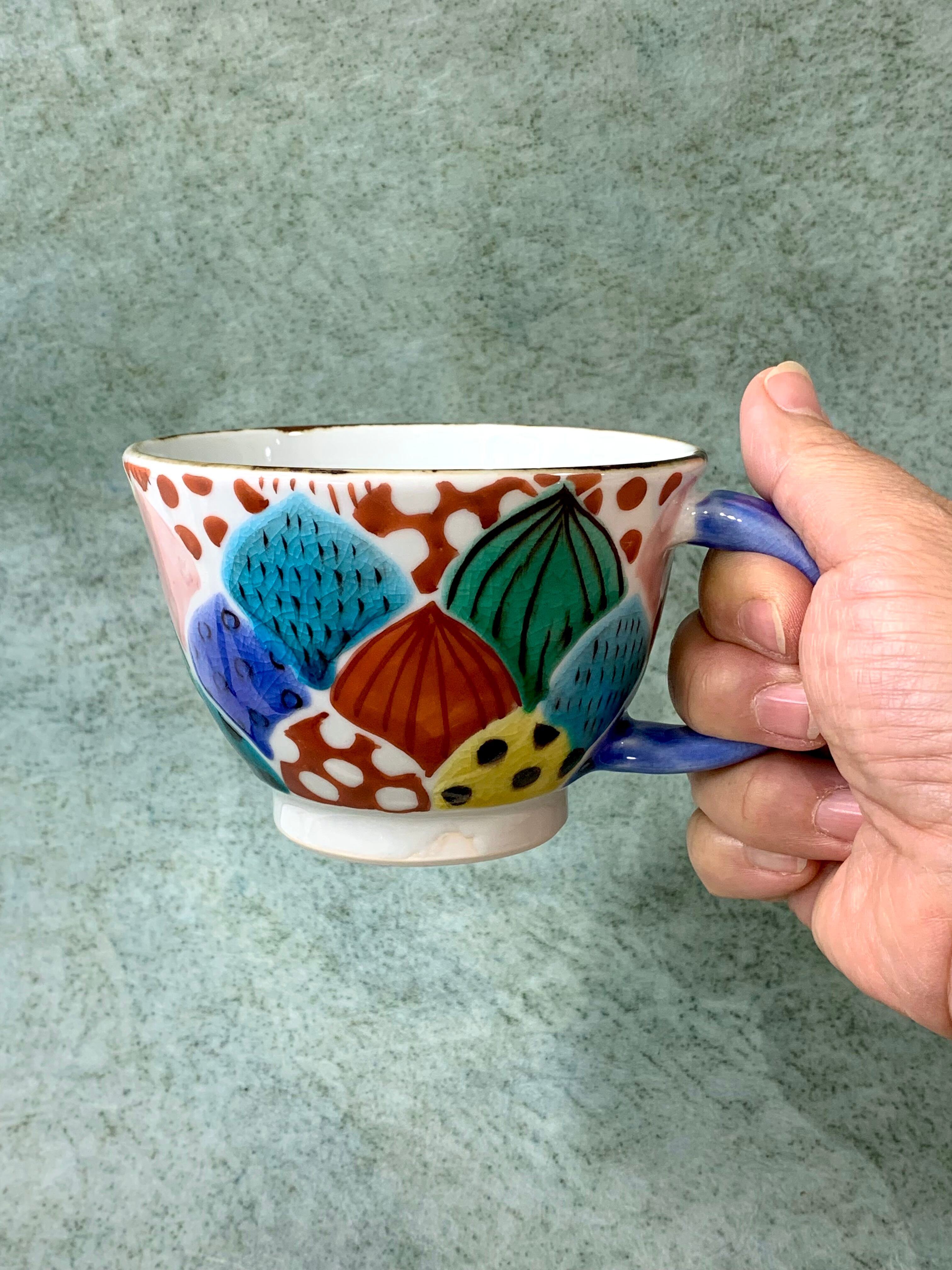 ポップで楽しい九谷焼のマグカップ。びっしり手描きの文様はカップごとに違います。たっぷりサイズなので、スープカップにも!